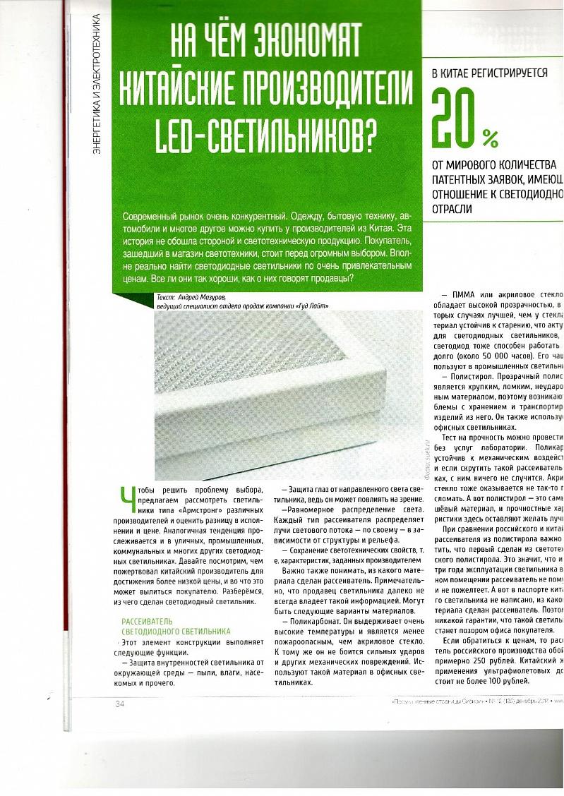 При сравнении российского и китайского рассеивателя из полистерола важно отметить, что первый сделан из светотехнического полистирола. Это значит, что и за три года эксплуатации светильника в офисном помещении рассеиватель не помутнеет и не пожелтеет. А вот в паспорте китайского светильника не написано, из какого материала сделан рассеиватель. Поэтому никакой гарантии, что такой светильник не станет позором офиса покупателя.